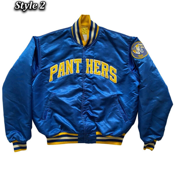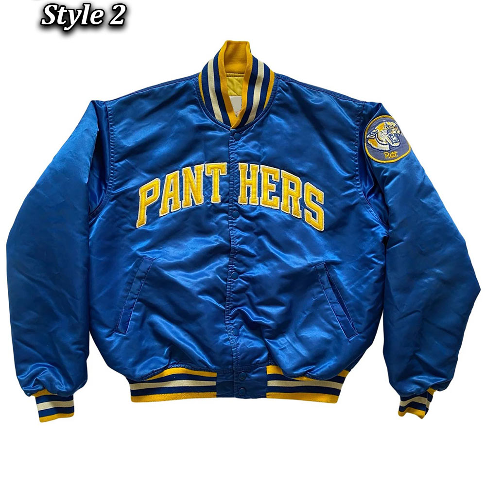 Inspired by: An American football team Pittsburgh Panthers Material: satin Color: blue Collar: rib knitted collar Front: buttoned closure Logo appliqued on front and sleeves/”Pitt” appliqued on chest Inner: soft viscose lining Cuffs: rib knitted cuffs Sleeves: long and fitting Fine quality stitching Pockets: two side waist pockets 2 Styles For both genders
