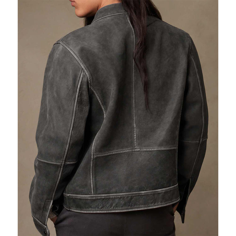 Material: Real Leather Inner: Viscose Lining Closure: Front Zipper Closure Collar: Snap-tab Collar Cuffs: Zipper Cuffs Color: Black