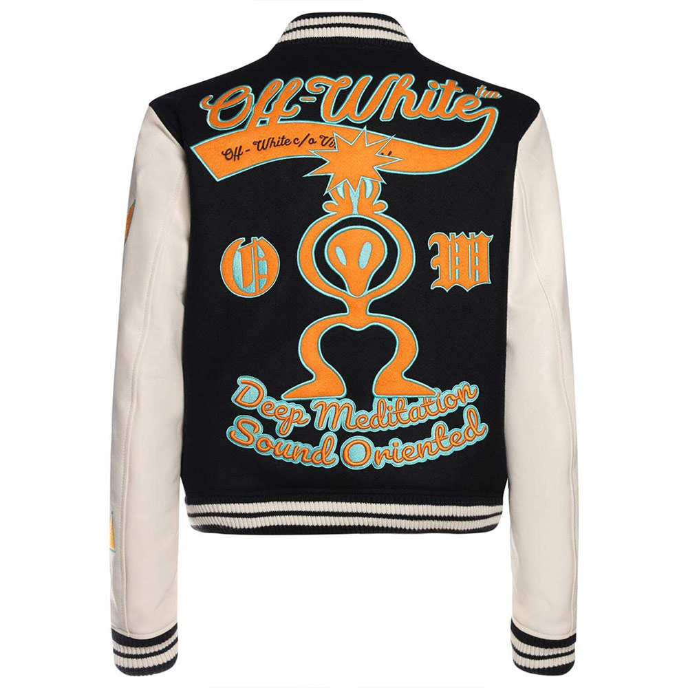 Suitable for all genders Inspired By: Rumi Carter and Super Bowl LVIII Material: Body made from wool and Sleeves made from Genuine leather Lining: Viscose lining Color: Available in black and off-white color Front: Snap Tab Buttoned Closure Collar: Rib Knitted Striped Collar Sleeves: Long Sleeves Cuffs: Rib Knitted Striped Cuffs Hemline: Rib Knitted Striped Waistband Stitching: Fine Pockets: Two waist pockets on the front Logo: Super Bowl LVIII logo on the front, sleeves, and back
