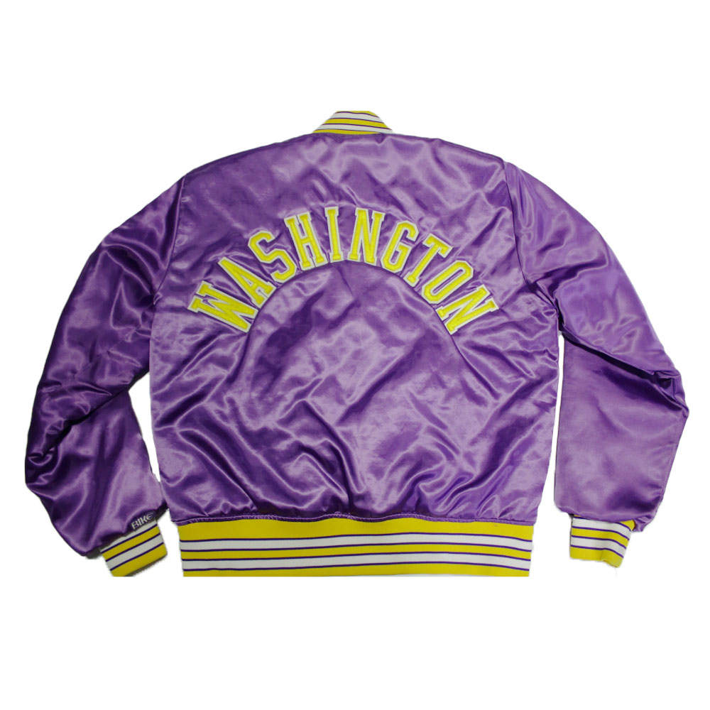 For both genders Inspired by football team: Washington Huskies Material: Satin Color: Purple Inner: Viscose lining Collar: Ribbed Front: Snap tab closure Sleeves: Full and fitted Cuffs: Ribbed Pockets: Two slanted waist pockets, one inner pocket Hemline: Ribbed Logo: Embroidered logo is featured on chest, “Washington” lettering is featured on back Superb stitching