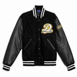 Suitable for all genders Inspired By: Dreamville Letterman Material: Body made from wool and Sleeves made from Genuine leather Lining: Viscose lining Color: Black color Front: Full Snap Tab Buttoned Closure Collar: Rib Knitted Striped Collar Sleeves: Long Sleeves Cuffs: Rib Knitted Striped Cuffs Hemline: Rib Knitted Striped Waistband Stitching: Fine Pockets: Two waist pockets on the front Logo: Dreamville logo on the front, back, and sleeve