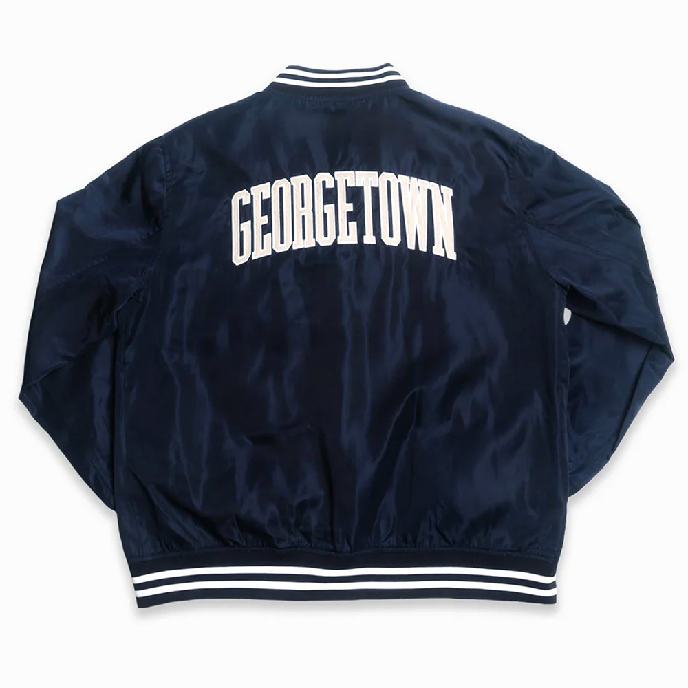 Suitable for all genders Inspired By: Georgetown Hoyas Material: Satin Material Lining: Viscose lining Color: Available in navy blue color Front: Snap Tab Buttoned Closure Collar: Rib Knitted Striped Collar Sleeves: Long Sleeves Cuffs: Rib Knitted Striped Cuffs Hemline: Rib Knitted Striped Waistband Stitching: Fine Pockets: Two waist pockets on the front Logo: Georgetown Hoyas Script logo on the front and back