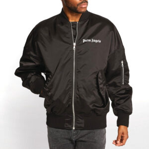 For both genders Material: Satin Inner: Viscose lining Color: Black Collar: Ribbed Front: Zipper closure Sleeves: Long and fitted Cuffs: Ribbed Pockets: Two slanted waist pockets ,one inner pocket Hemline: Ribbed Logo: “Palm Angels” lettering is featured on front, distinctive logo is featured on back Perfect stitching