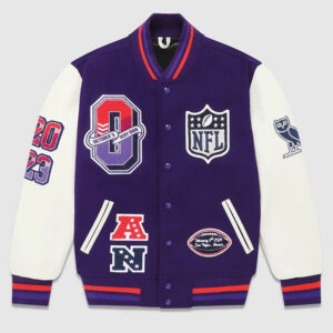 Suitable for all genders Inspired By: OVO and Super Bowl LVIII Material: Body made from wool and Sleeves made from Genuine leather Lining: Viscose lining Color: Available in purple and white color Front: Snap Tab Buttoned Closure Collar: Rib Knitted Striped Collar Sleeves: Long Sleeves Cuffs: Rib Knitted Striped Cuffs Hemline: Rib Knitted Striped Waistband Stitching: Fine Pockets: Two waist pockets on the front Logo: OVO and Super Bowl LVIII logo on the front, sleeves, and back