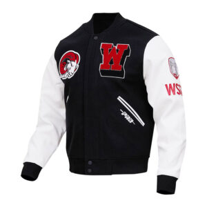 Inspired By: Winston-Salem State  Football team Worn By: Players of team Material: Body made wool and Sleek Sleeves made from Genuine leather Collar: Rib-knit collar Cuffs: Rib-knit cuffs Front Closure: Branded YKK Zipper Front Hemline: Rib-knit hemline Logo: Embellished with the Winston-Salem State Rams emblem Color: Black and White Gender: An ode to all genders Sleeves: Long and Fitted Fine quality stitching