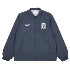 For both genders Inspired by baseball team: Detroit Tigers Material: Polyester Color: Navy Inner: Viscose lining Collar: Shirt style Front: Snap tab closure Sleeves: Long and fitted Cuffs: Elastic Pockets: Two slanted waist pockets, one inner pocket Hemline: Elastic Logo: Multiple logos are featured on front and back, “Detroit Palace” lettering on the back Good stitching