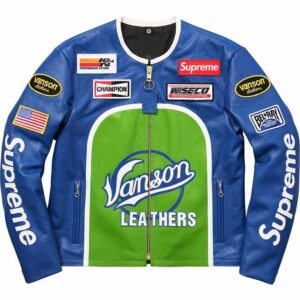 Suitable for all genders Inspired By: Supreme Vanson Material: Genuine leather Lining: Viscose lining Color: Black, and White Front: Full Zip Closure Collar: Rounded Style Collar Sleeves: Long Sleeves Cuffs: Zipper Style Cuffs Stitching: Fine Pockets: Two zipper waist pockets on the front Logo: Supreme Vanson multiple logos on the front, sleeves, and back