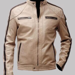 Material: Real Leather Inner: Viscose Lining Closure: Front Zipper Closure Collar: Snap-tab Collar Cuffs: Zipper Cuffs Color: Beige