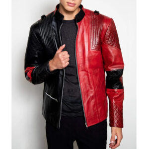 $180.16 – $188.78Price range: $180.16 through $188.78For both genders Inspired by the song: Ha Live Fast Die Worn by: Harley Quinn Material: Genuine leather Inner: Viscose lining Color: Red and black Collar: Stand up style Front: Zipper closure Sleeves: Full and fitted Cuffs: Zippered Pockets: One zipper pocket on the waist and internal pocket Quilted detailing on shoulders and sleeves Logo: “Live Fast Die Clown” is written on the back Refined stitching