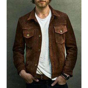 Material: Suede leather Color: Brown color Collar: Shirt style collar Front: Snap tab buttoned front closure Sleeves: Full-length Cuffs: Buttoned Cuffs Inner: Soft viscose lining Fine quality stitching Pockets: Two front chest pockets