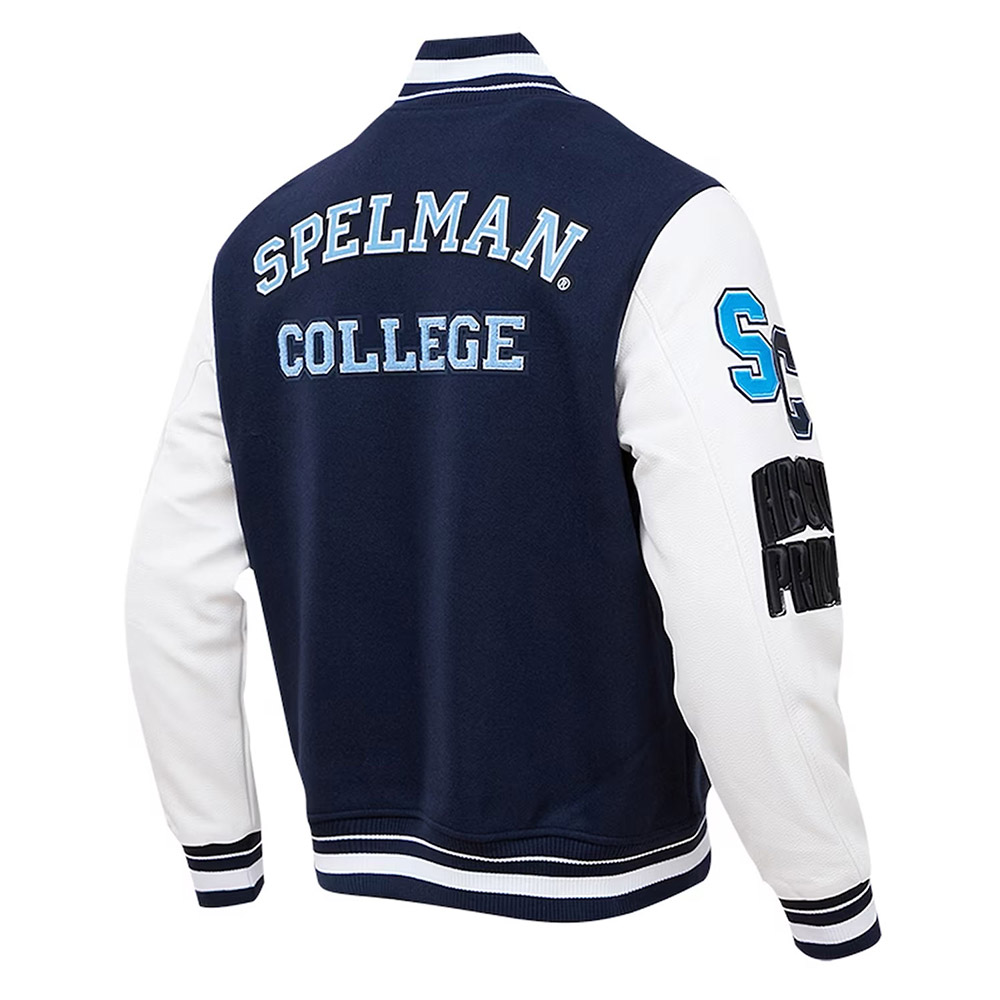 Inspired By: Spelman College Jaguars basketball team Worn By: Players of team Material: Body made wool and Sleeves made from Genuine leather Collar: Rib-knit collar Front: Full-zip front closure Cuffs: Rib-knit cuffs Hemline: Rib-knit hemline Logo: Spelman College Jaguars emblem Pockets: Two side pockets Color: Navy and White Gender: Both Sleeves: Long and Fitted Fine quality stitching
