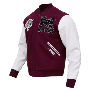 Inspired By: Tigers Morehouse College football team Worn By: Devoted enthusiasts Material: Body made from wool, Sleeves made from genuine leather Internal: Soft viscose lining Collar: Rib-knit collar Front: Full-zip front closure Sleeves: Long sleeves with rib-knit cuffs Cuffs: Rib-knit cuffs Hemline: Rib-knit hemline Pockets: Two inner pockets, two side pockets Logo: Morehouse College Tigers emblem on chest Color: Maroon Gender: Both Fine quality stitching