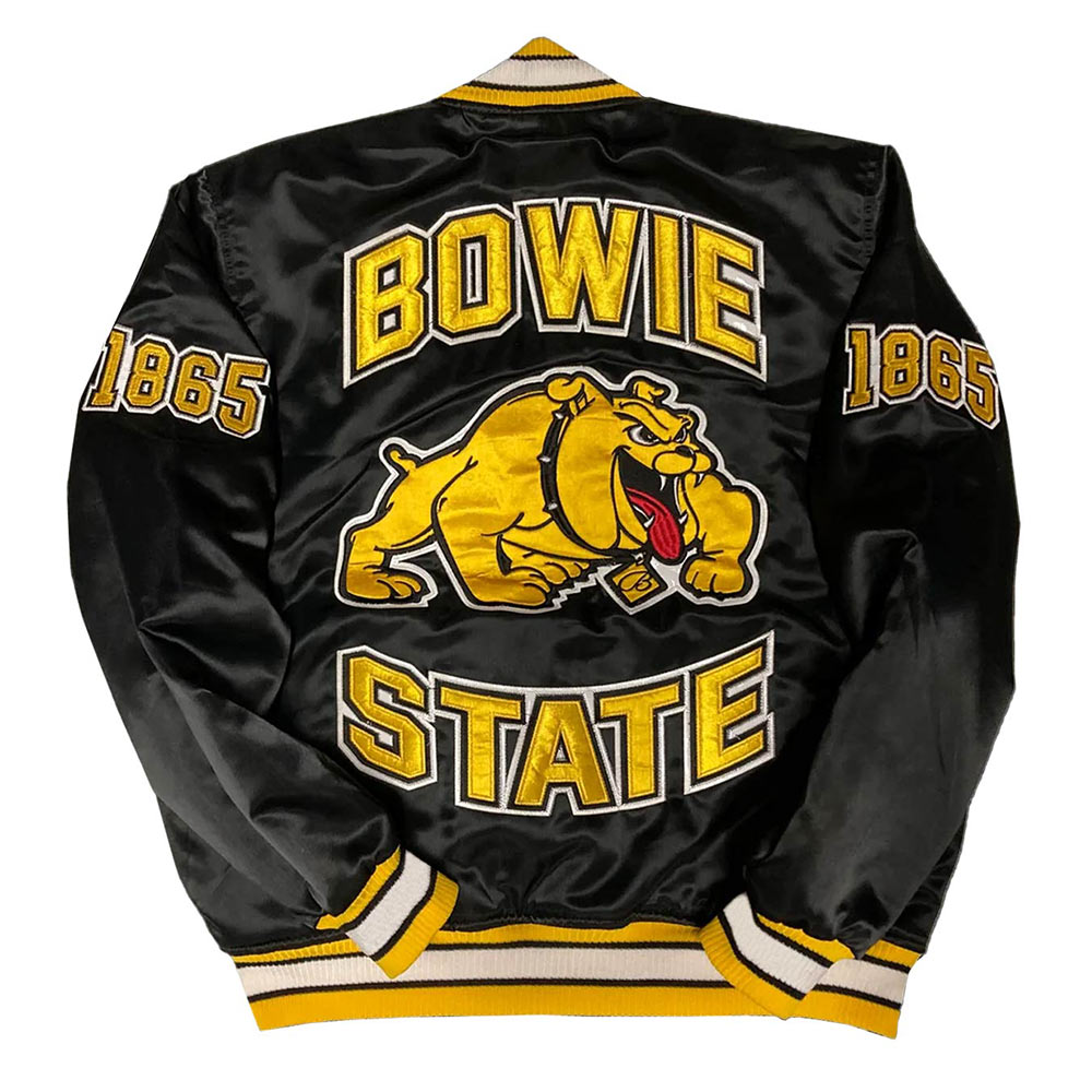 Suitable for all genders Inspired By: Men’s Bowie State University Material: Satin Material Lining: Viscose lining Color: Black Front: Full Snap Tab Buttoned Closure Collar: Rib Knitted Striped Collar Sleeves: Long Sleeves Cuffs: Rib Knitted Striped Cuffs Hemline: Rib Knitted Striped Waistband Stitching: Fine Pockets: Two zipper waist pockets on the front Logo: Bowie State University logo on the front, sleeves, and back