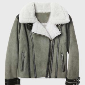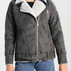 Material: Real Leather Inner: Viscose Lining Closure: Front Zipper Closure Collar: Shearling Collar Cuffs: Shearling Belted Cuffs Color: Grey