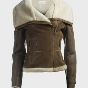 Material: Suede Leather Inner: Viscose Lining Closure: Front Zipper Closure Collar: Shearling Collar Cuffs: Open Hem Cuffs Color: Brown