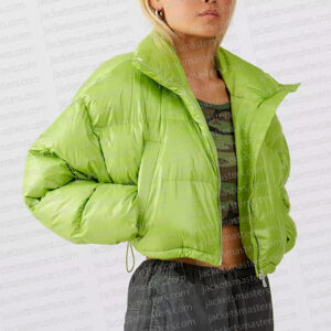 For both genders Puffer style Inspired by the movie: Monster High 2 Worn by: Ghoulia Played by: Lilah Fitzgerald Material: Polyester Inner: Viscose lining Color: Green Collar: High neck style Front: Zipper closure Sleeves: Long and fitted Cuffs: Open hem style