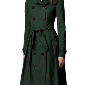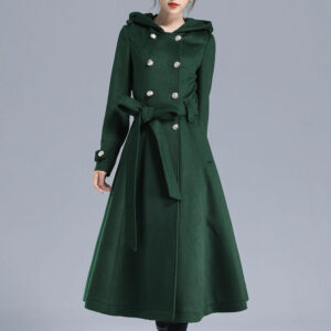 Material: Wool Inner: Viscose lining Color: Green Hood attached on the back Front: Belted over double breasted button closure Straps on shoulder Sleeves: Full and fitted Cuffs: Belted Pockets: Two slanted waist pockets, one inner pocket Fine quality stitching