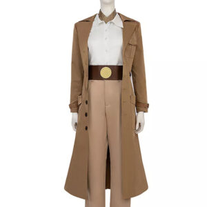 For both genders Inspired by the movie: Deadpool & Wolverine Worn by: Cassandra nova Played by: Emma Corrin Material: Cotton Inner: Viscose lining Color: Brown Collar: Lapel style Front: Buttoned closure Sleeves: Full and fitted Cuffs: Open hem Pockets: Two waist flap pocket one flap chest pocket and inner pocket Refined stitching