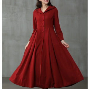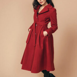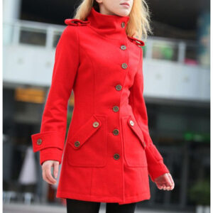 Material: Wool Inner: Viscose lining Color: Red Collar: Stand up style Front: Buttoned closure Straps on shoulders Sleeves: Full in length Cuffs: Belted Pockets: Two stylish waist pockets with buttons, one inner pocket Marvelous stitching