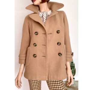 Material: Wool Color: Brown Inner: Viscose lining Collar: Lapel style Front: Double breasted button closure Sleeves: Long and fitted Cuffs: Belted Pockets: Two flap waist pockets, one inner pocket Refined stitching
