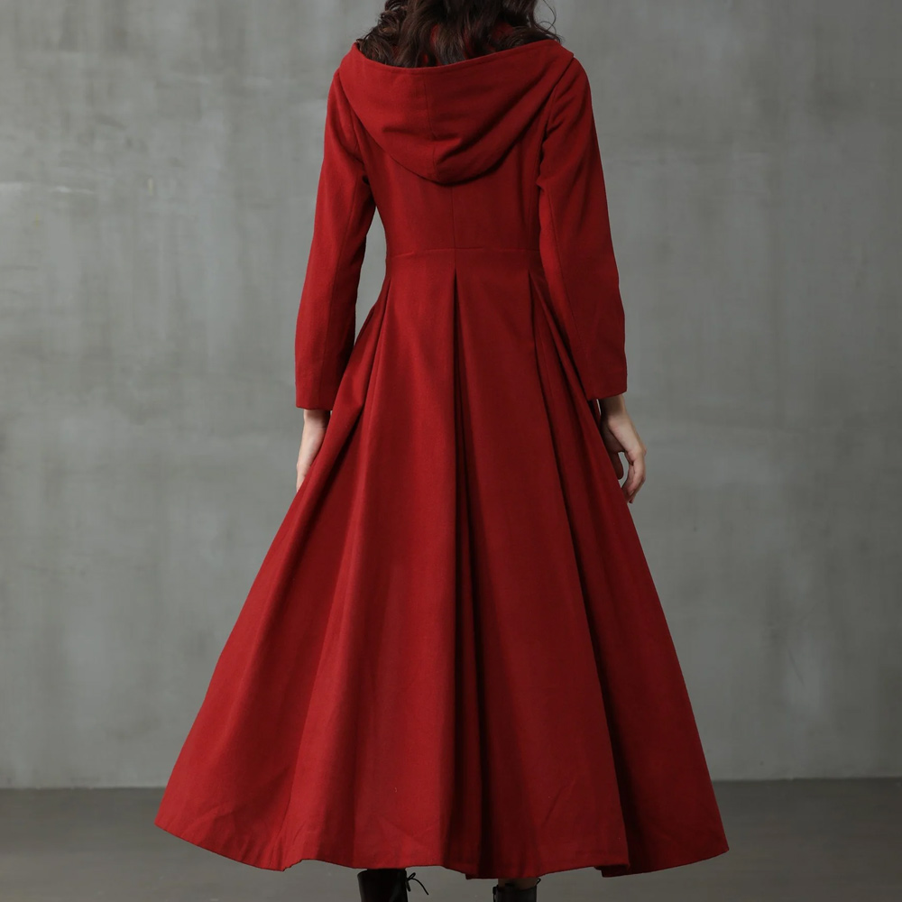 Material: Wool Inner: Viscose lining Color: Red Hooded attached on the back Front: Buttoned closure Sleeves: Long and fitted Cuffs: Open hem Pockets: Two slanted waist pockets, one inner pocket Refined stitching