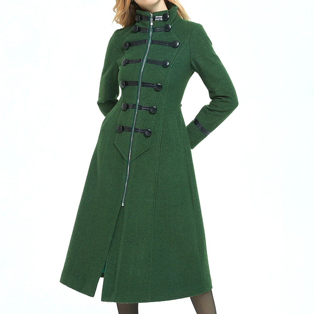 Material: Wool Inner: Viscose lining Color: Green Collar: Stand up style Front: Military style full zipper closure Sleeves: Full in length Cuffs: Open hem Pockets: Two slanted waist ,one inner pocket Button strap at the back Refined stitching