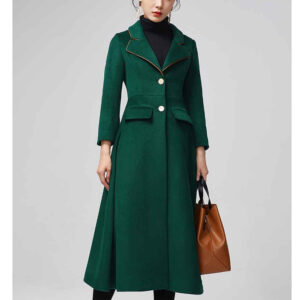 Material: Wool Inner: Viscose lining Color: Green Collar: Lapel style Front: Buttoned closure Sleeves: Full and fitted Cuffs: Open hem Pockets: Two flap waist pockets ,one inner pocket Excellent stitching