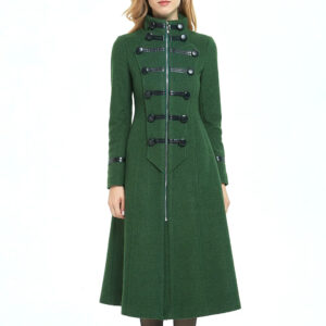Material: Wool Inner: Viscose lining Color: Green Collar: Stand up style Front: Military style full zipper closure Sleeves: Full in length Cuffs: Open hem Pockets: Two slanted waist ,one inner pocket Button strap at the back Refined stitching
