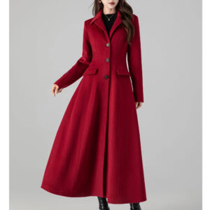 Material: Wool Inner: Viscose lining Color: Red Collar: Stand up style Front: Buttoned closure Straps on shoulders Sleeves: Full in length Cuffs: Belted Pockets: Two stylish waist pockets with buttons, one inner pocket Marvelous stitching