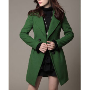 Material: Wool Inner: Viscose lining Color: Green Collar: Lapel style Front: Double breasted button closure Sleeves: Long in length Cuffs: Open hem Pockets: Two slanted waist pockets, one inner pocket Exclusive stitching