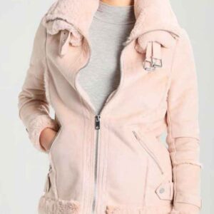 Material: Suede Leather Inner: Viscose Lining Closure: Front Zipper Closure Collar: Shearling Collar Color: Pink