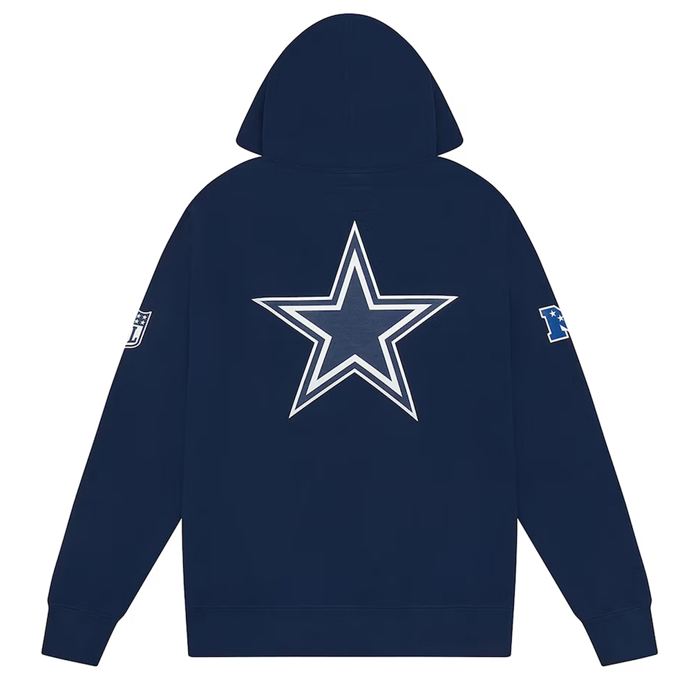 Inspired By: An American Football Team Dallas Cowboys Worn By: Player of the team Material: Fleece Internal: Viscose Lining Collar: Hooded collar Front: Closed front Closure Sleeves: Long Sleeves Cuffs: Rib Knitted cuffs Hemline: Rib Knitted Hemline Pockets: Two inner and two side Pockets Color: Navy Blue