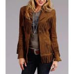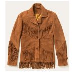 Immerse yourself in a symphony of fashion exuberance offered by FDwears, the Suede leather fringe jacket womens. Expertly sculpted from lavish suede leather, it unveils a commanding brown color that emanates an air of unparalleled uniqueness. The shirt-style collar and iconic buttoned closure intertwine in seamless harmony, presenting a fusion of style and self-confidence. Its distinctive design stands as a bold proclamation, making it a prime choice for spirited gatherings with friends.