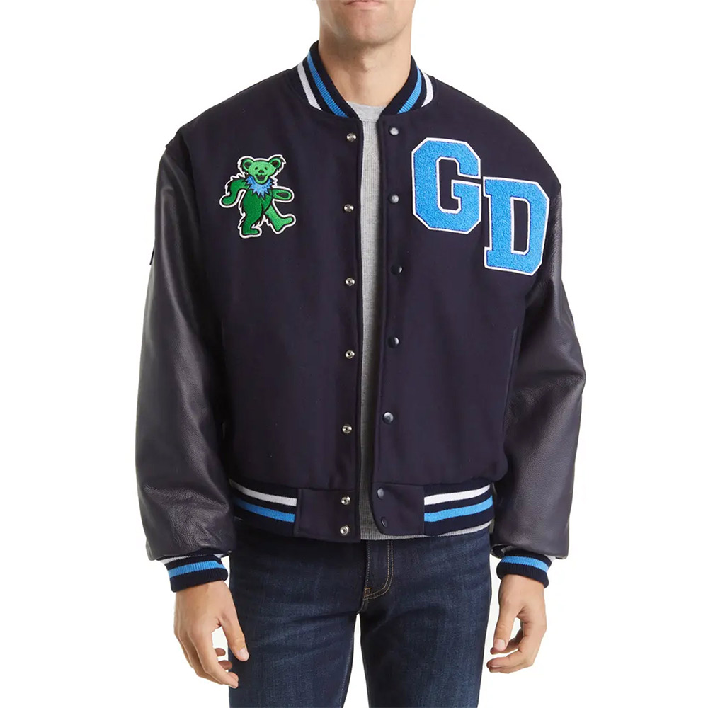 Navy Grateful Dead Water Resistant Varsity Full-Snap Wool/Leather Jacket