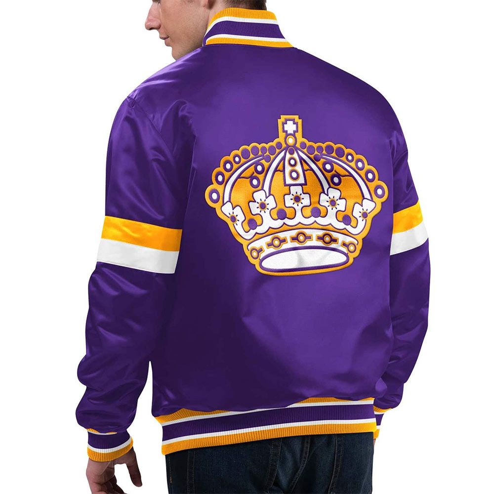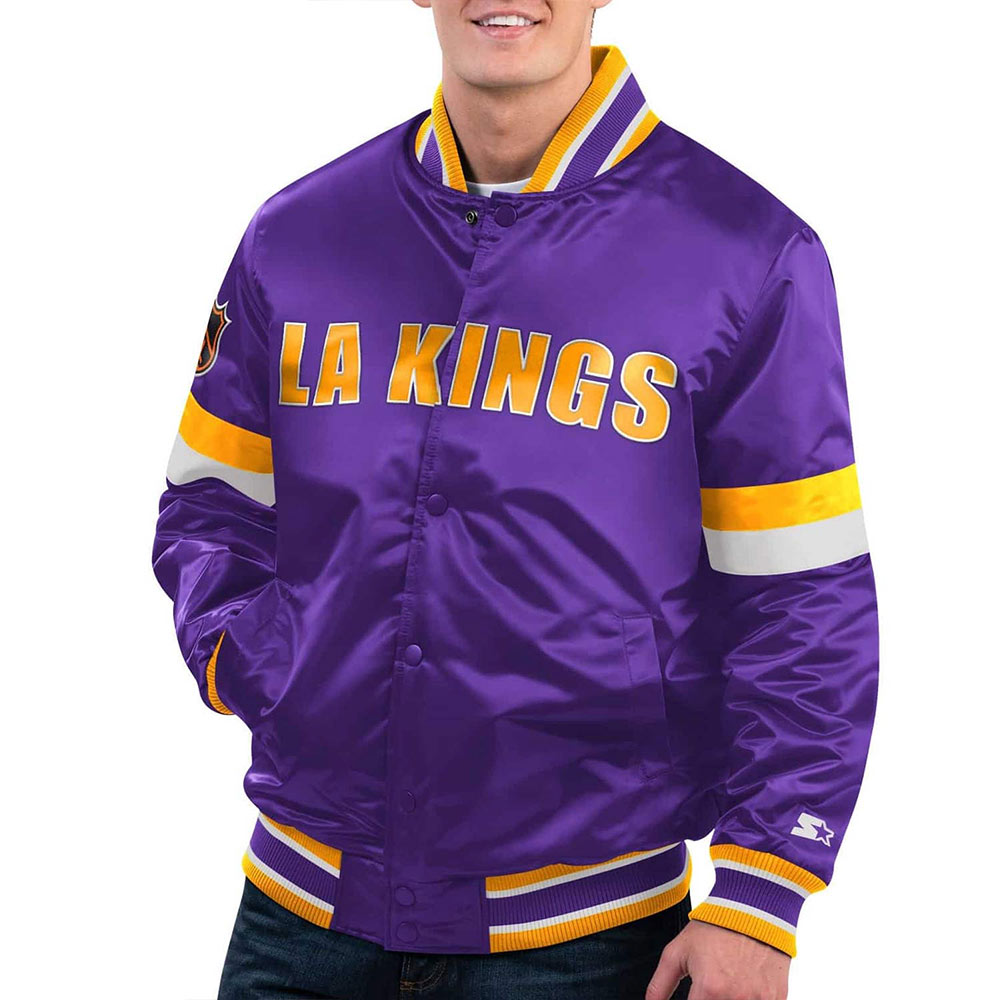 Immerse yourself in luxury with this Los Angeles Kings Diveplay Jacket, offered by FDwears, crafted from the smooth satin material and Viscose lining, providing unmatched comfort. This jacket is a tribute to sports sophistication suitable for all genders. The striking purple hue and fine stitching make a bold fashion statement.