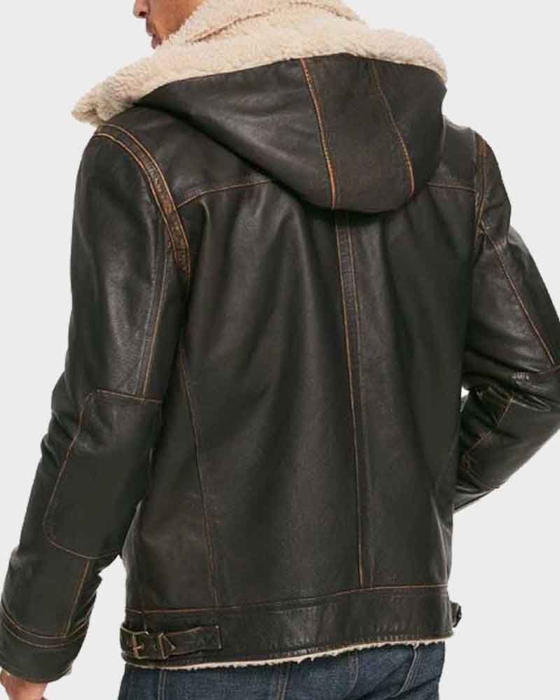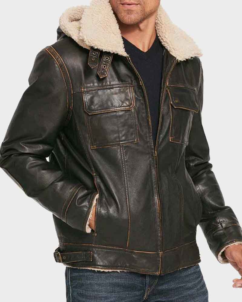 This Mens Brown Leather Aviator Jacket is the origination of the best-quality original leather and consists of an inner stitched viscose lining to keep you comfortable. Its aspects comprise a hooded shirt style shearling collar, open hem cuffs, belted straps on the side waist, and front zip fastening. The jacket also includes two flap pockets at the chest and two pockets at the waist.