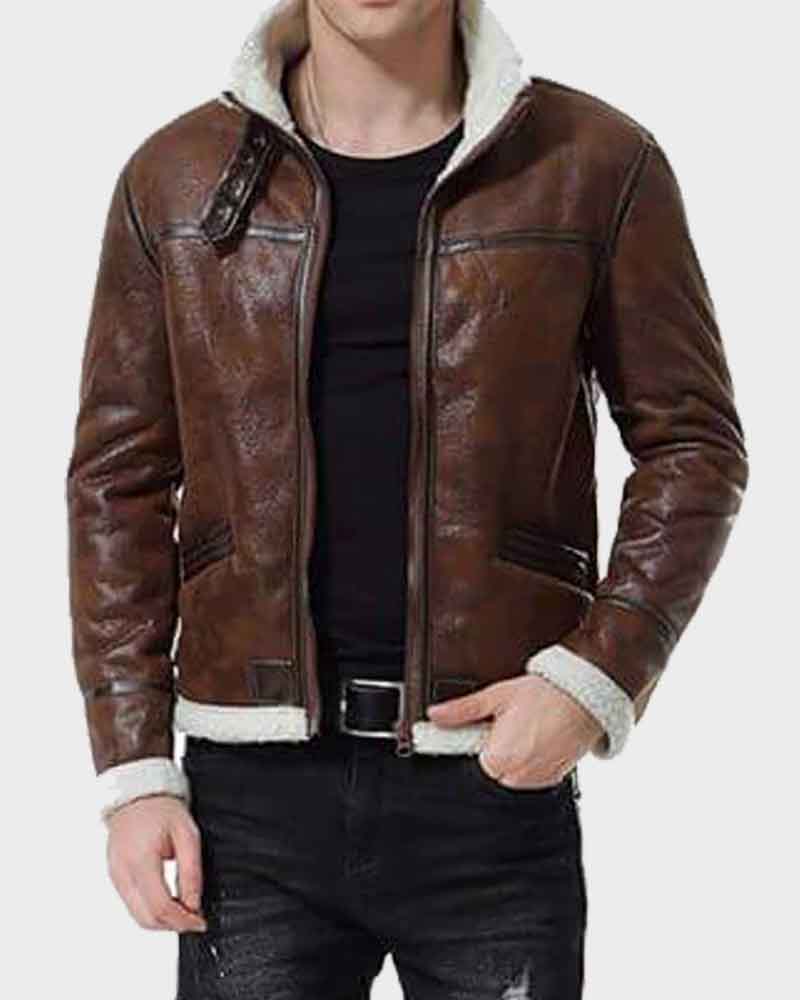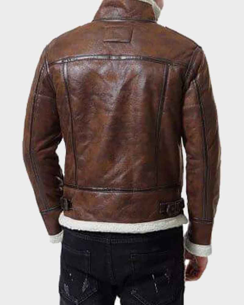 This Distressed Brown Aviator Leather Jacket is a fabrication of high-quality original leather and contains a shearling lining which is present inside to make it comfortable. Its aspects feature shirt style belted shearling collar, shearling cuffs, shearling hemline, and front zip fastening; furthermore, the jacket also consists of two pockets at the waist.