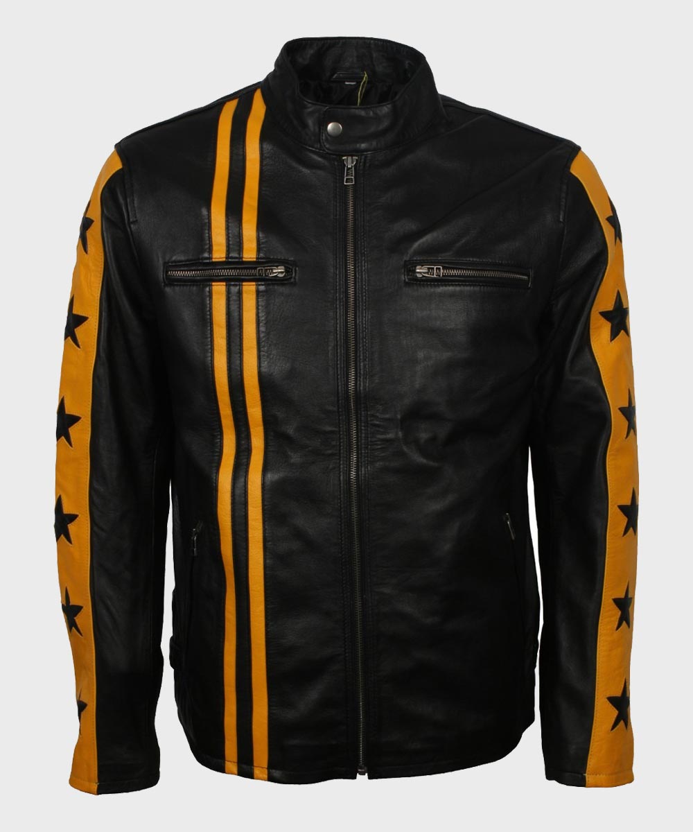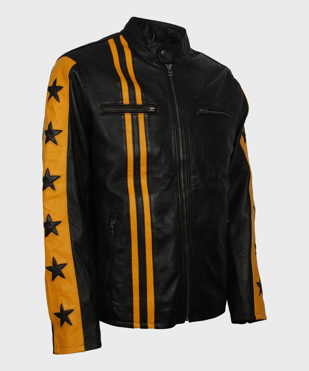Mens Black Leather Yellow Star Stripes Cafe Racer Jacket