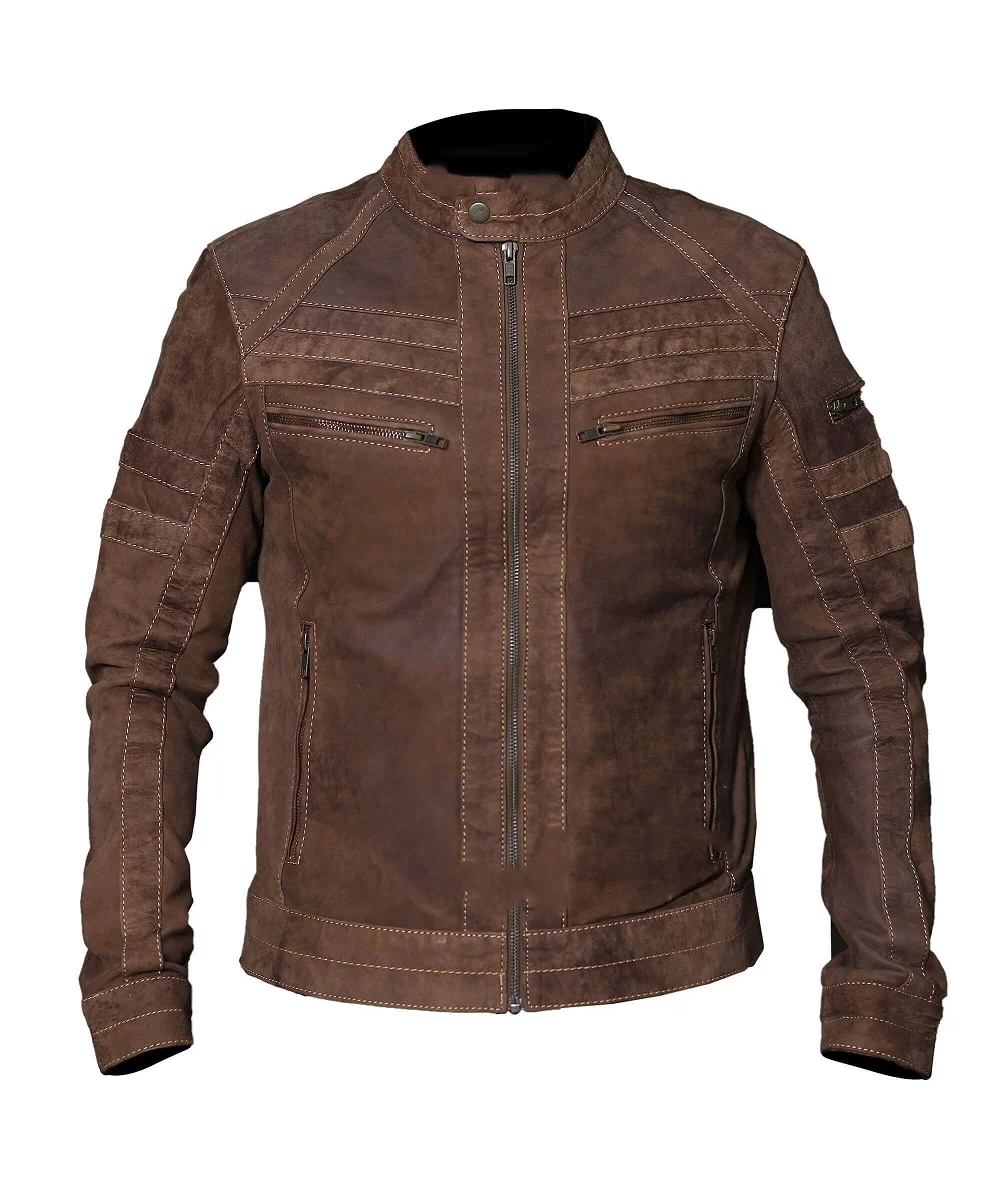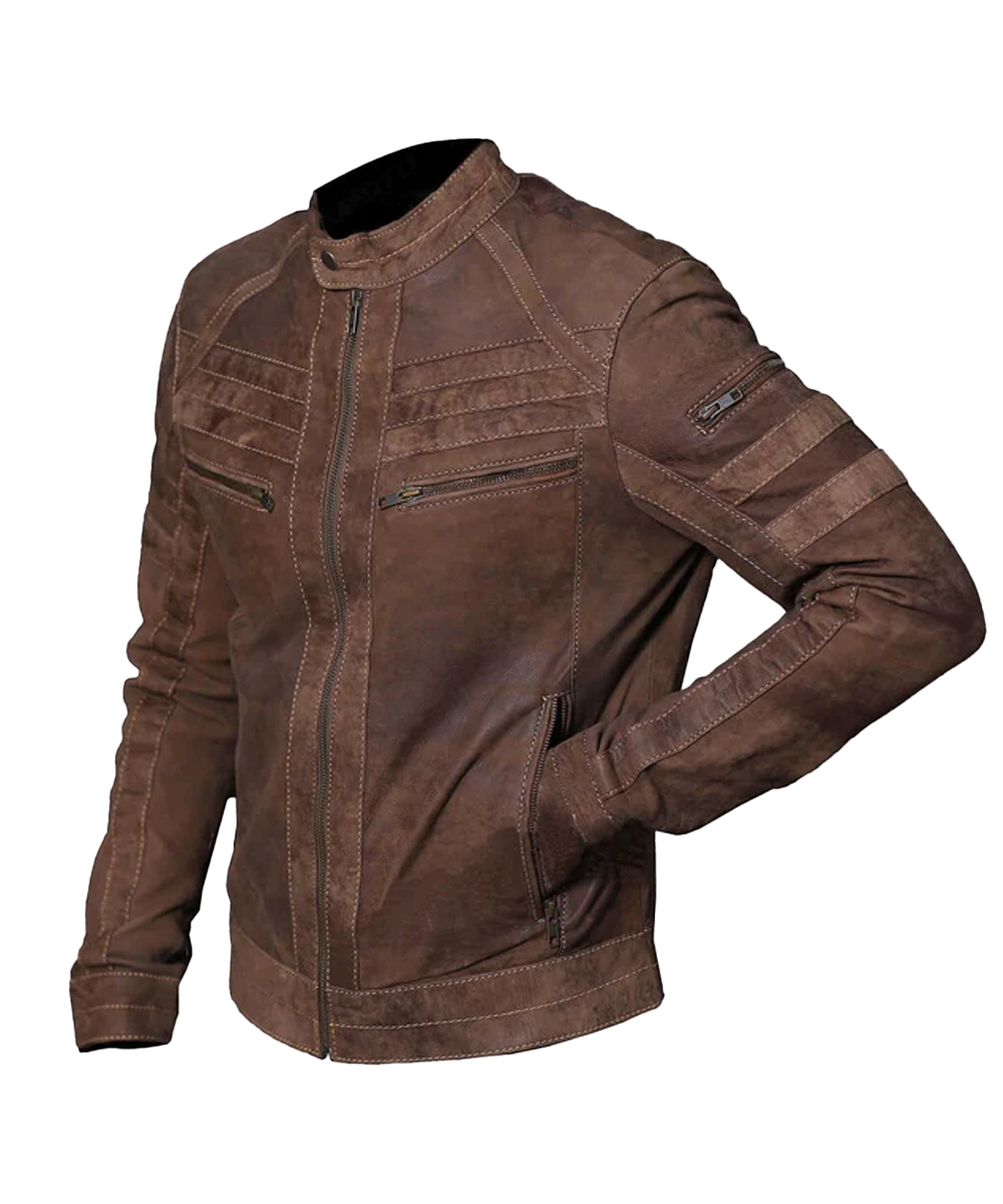 This Mens Leather Brown Distressed Jacket is an augmentation of genuine leather and features a viscose lining which is available inside to make it soothing. Its specifications accommodate an erected snap-tab collar, buttoned cuffs, multiple stripes at the chest, and front zip fastening. The jacket also contains two zippers at the chest, a zipper at the sleeve, and two zipper pockets at the waist.