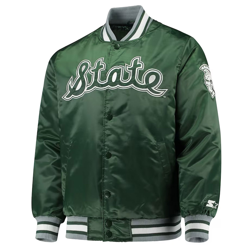 A favored choice for discerning men and women, the Michigan State Spartans O-Line Green Varsity Satin Jacket encapsulates fashion’s essence.