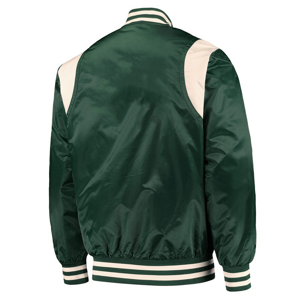 Meticulous craftsmanship guarantees the jacket’s enduring quality. With its impeccable blend of style and substance, the Michigan State Spartans Teddy Green Varsity Satin Jacket stands as a favored choice among discerning men and women with an eye for fashion.