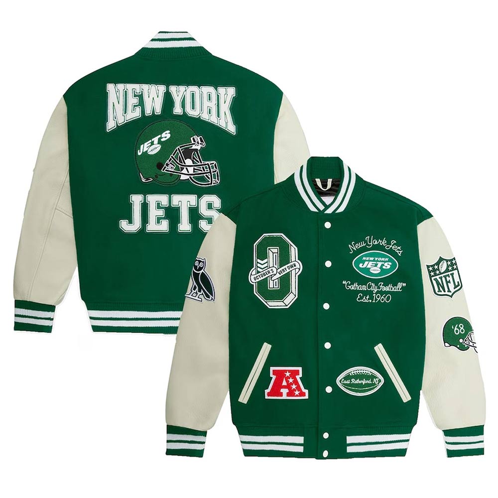 OVO New York Jets Green and White Full Snap Varsity Wool/Leather Jacket