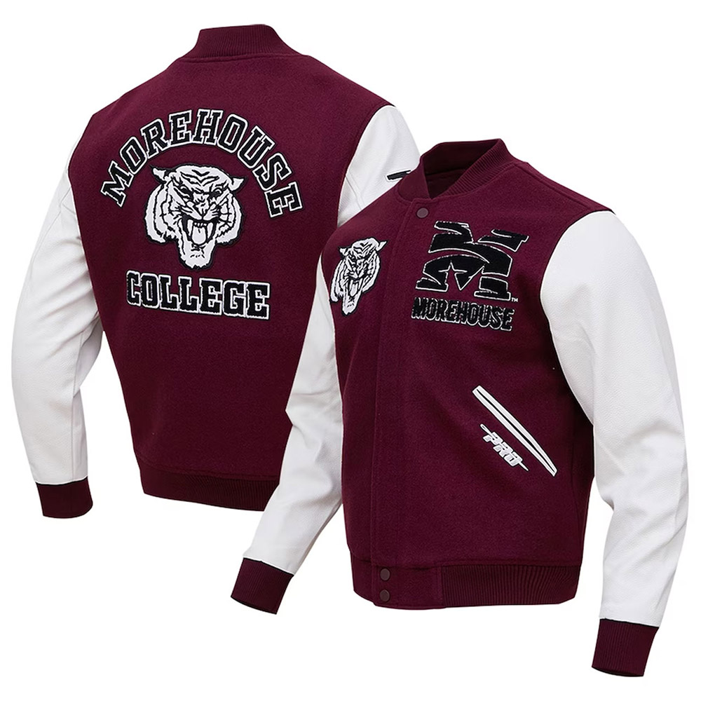 Embark on a journey of style and legacy with the Tigers Morehouse College Varsity Maroon Jacket. This unisex masterpiece offered by FDwears, seamlessly blends premium materials and classic design, setting you apart as a trendsetter. The body, made from wool, and the sleeves, crafted from genuine leather, symbolize the perfect blend of durability and sophistication. The maroon hue exudes timeless charm, reflecting the Tigers Morehouse College team spirit. The full-zip front closure adds functional flair, while the Morehouse College Tigers emblem on the chest embodies your unwavering support.
