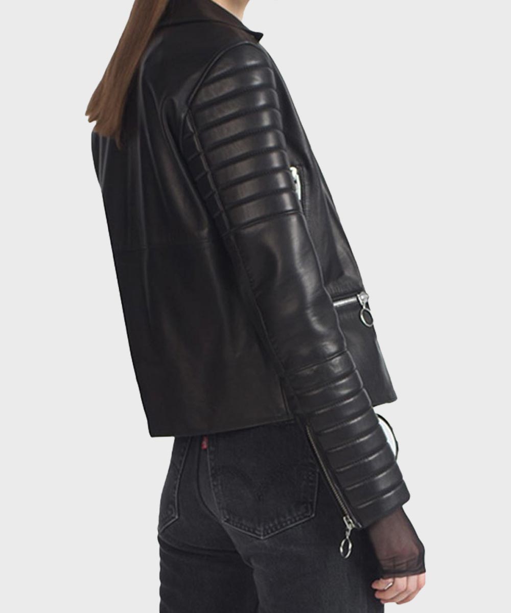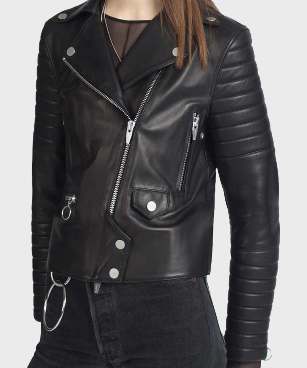 Specially and exceptionally, the suggested Padded Sleeves Women’s Black Motorcycle Leather Jacket features some silver rings, which makes it unique and it enhances its design’s significance. This jacket is made from the best-quality genuine leather, which is shaped in a marvelous structure. A viscose lining is bordered on its interior side to make your winters more comforting by giving you a relaxed & warm feel. Moreover, its exterior attributes contain padded sleeves, an asymmetrical front closure with snap buttons, a wide lapel collar, and zipper cuffs.