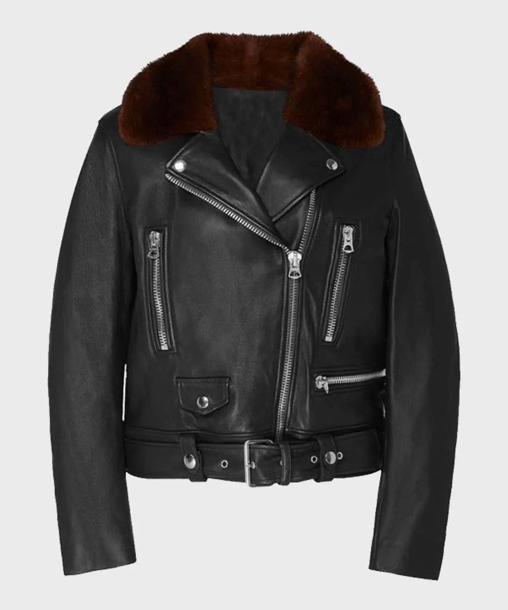 The Women’s Black Motorcycle Shearling Jacket is a fabrication of genuine top-class leather.