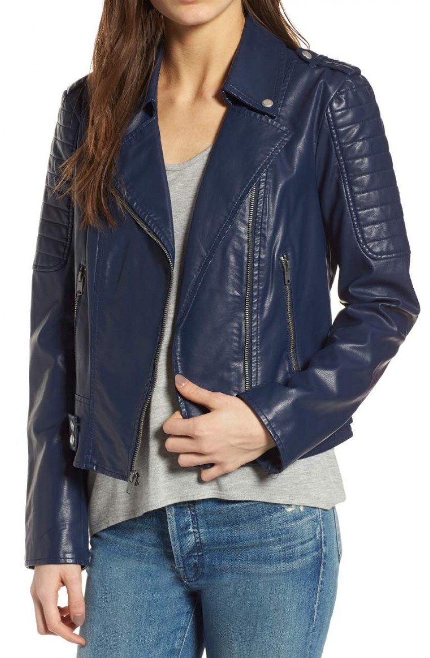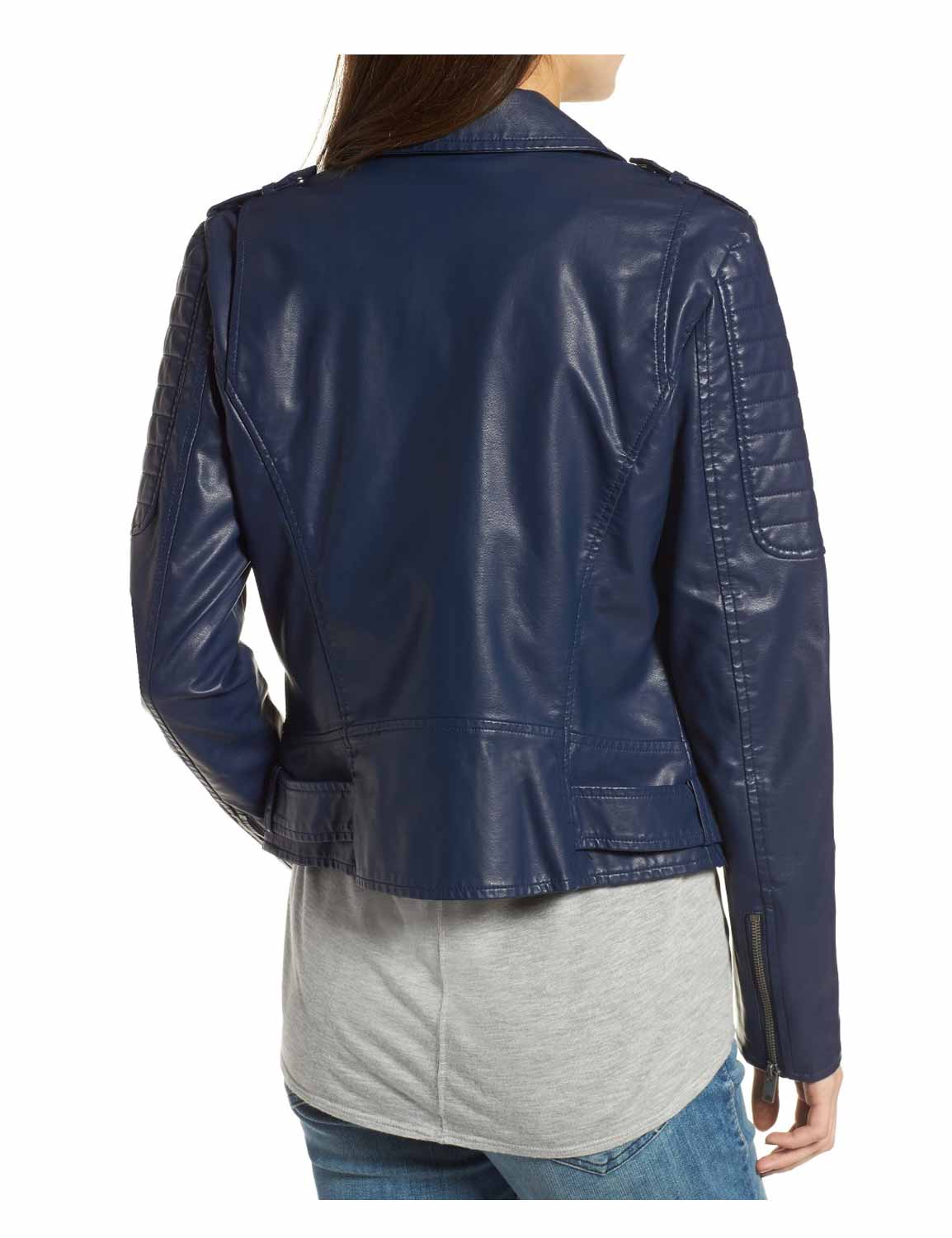 The Women Blue Biker Leather Jacket is a production of high-quality PU/Original leather consisting of a viscose lining to keep you comfortable. Its specifications comprehend a peak lapel collar, straps on shoulders, padded sleeves, open hem cuffs, and front asymmetrical zip closure; moreover, the jacket also includes two outside zipper pockets at the waist.