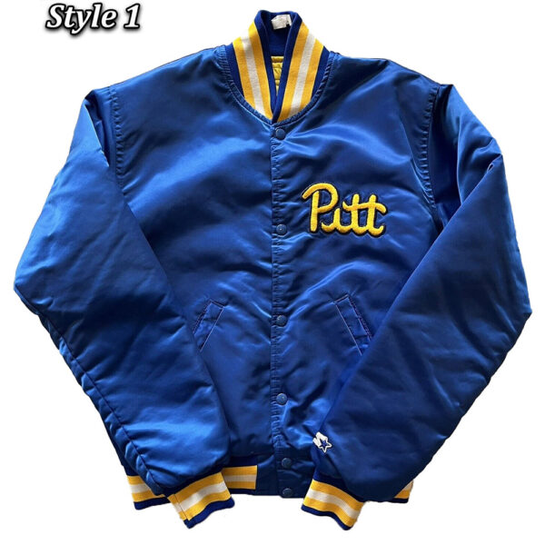Inspired by: An American football team Pittsburgh Panthers Material: satin Color: blue Collar: rib knitted collar Front: buttoned closure Logo appliqued on front and sleeves/”Pitt” appliqued on chest Inner: soft viscose lining Cuffs: rib knitted cuffs Sleeves: long and fitting Fine quality stitching Pockets: two side waist pockets 2 Styles For both genders